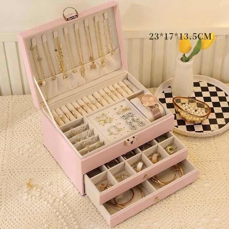 Porta Joias Grande de Luxo 3 Andares com Gaveta Organizador Multifuncional Feminino Elegante Rosa