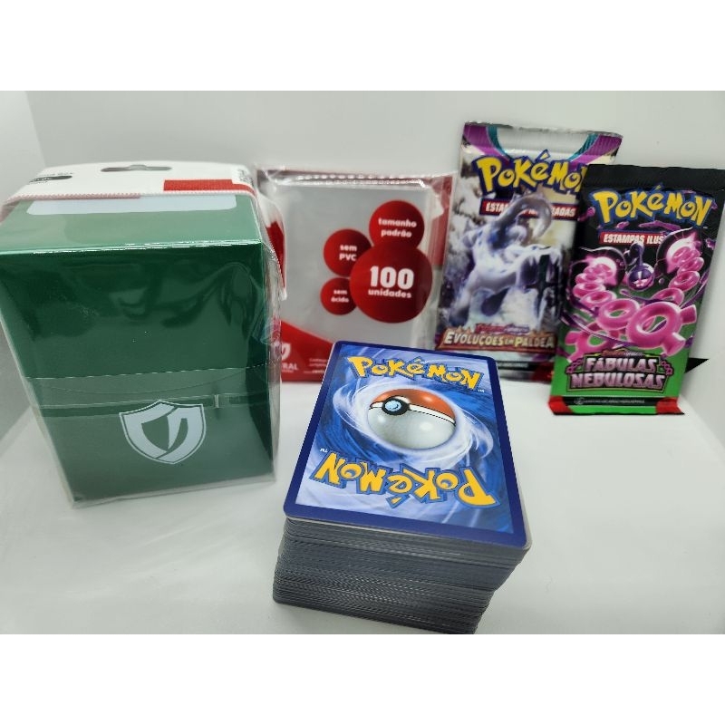 Lote Pokemon com 100 Cartas Originais + Deck Box + 2 boosters + Pack de Sleeves