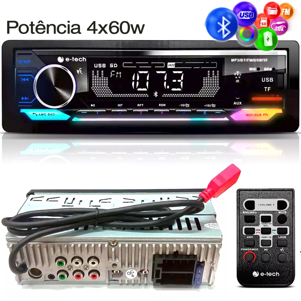 APARELHO DE SOM AUTOMOTIVO E-TECH RÁDIO MP3 PLAYER PREMIUM PLUS USB BLUETOOTH FM 1 DIN 4X60W POTENTE