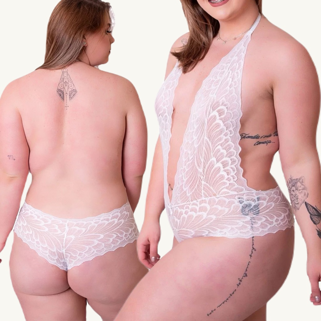 Lingerie Body De Renda Plus Size Super Decotado Muito Sexy Com As Costas Expostas Sem Bojo E Com Forro De Algodão. Super Sensual Caprichado Na Transparência / Bori Feminino / Bory Lingerie 48 / 50 / 52 (eg / Exgg / Xg / Xgg)