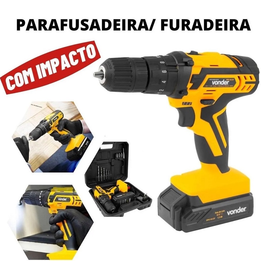 Furadeira Parafusadeira VONDER C/ Impacto 3/8 12V a Bateria Carregador BIVOLT PFV012I + Kit Brocas, Bits e Trena 5M, Garantia de Fábrica, Furadeira Vonder, Parafusadeira Vonder, Furadeira com Impacto