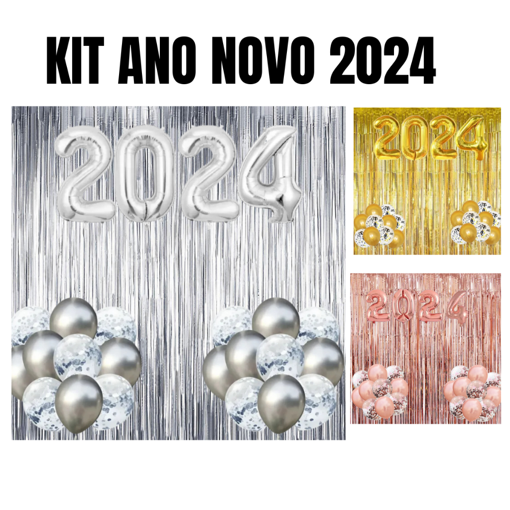 Kit Balão 2024 + 2 Cortina Metalizada + 10 Balões - Ano Novo