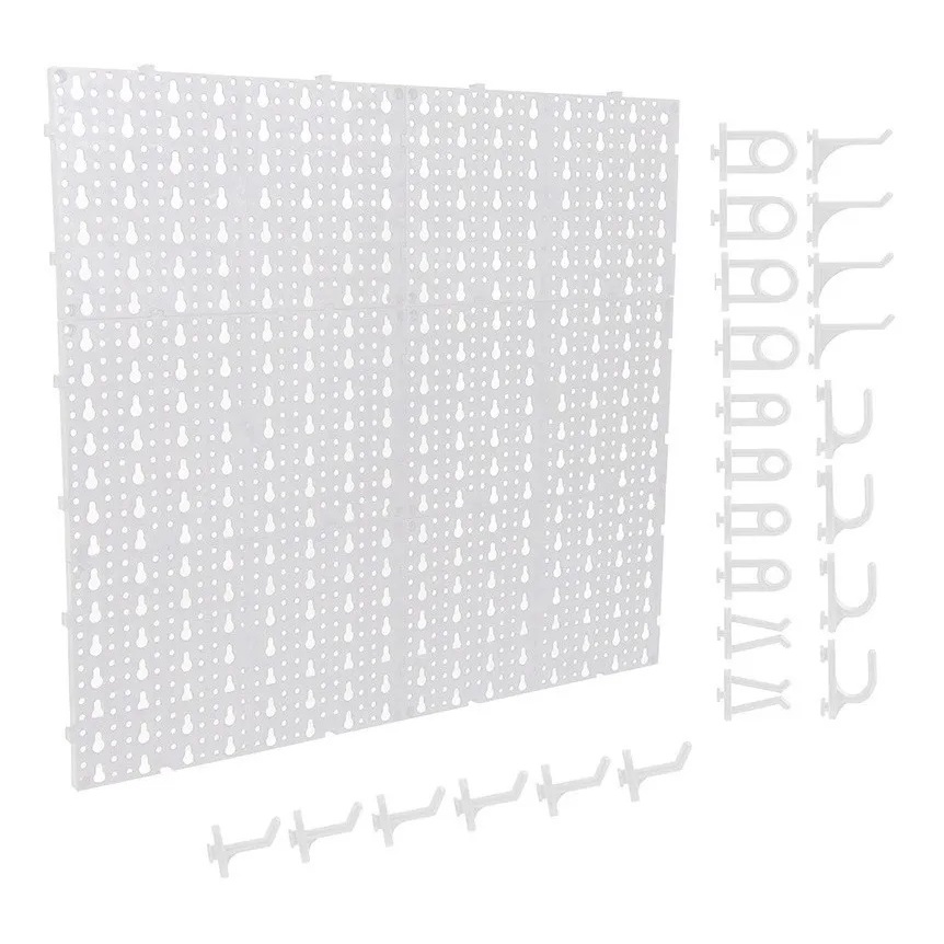 Painel Expositor De Ferramentas Modular 118cm x 52cm Em Plástico Perfurado Com 48 Ganchos Parede Branco - AMZ
