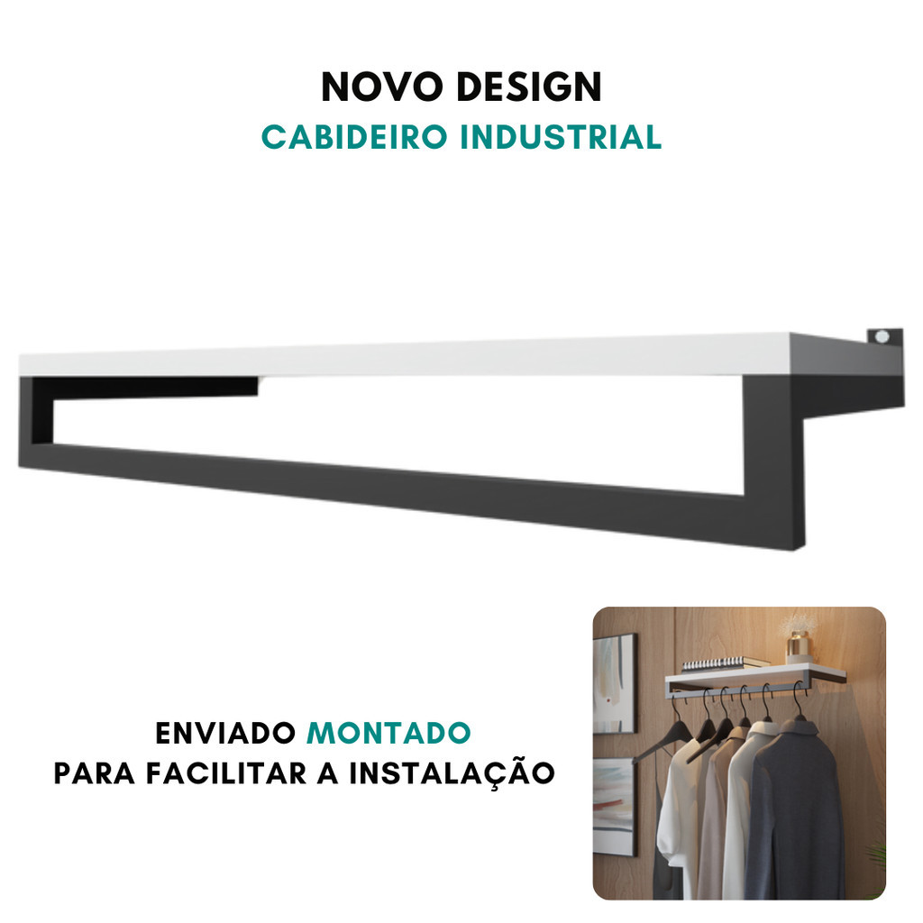 Cabideiro Industrial Closet Organizador de Parede Arara Suspensa MDF Prateleira