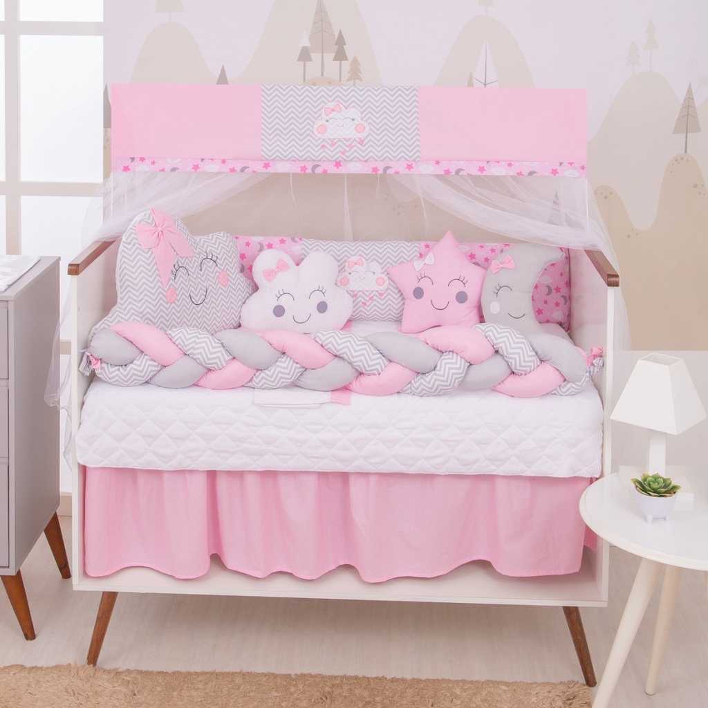 Kit Berço Trança Nuvem Rosa Americano Completo Lençol Berço Protetor Mosquiteiro Almofadas 11 Peças
