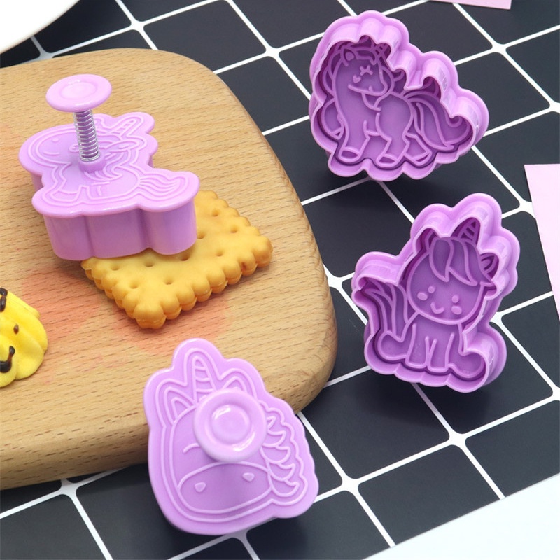 4Pcs/set Cortadores De Biscoitos Unicórnio Em Plástico 3D Forma De Desenho Animado Prensado Moldes Para Pastelaria Ferramentas Assar Gofra