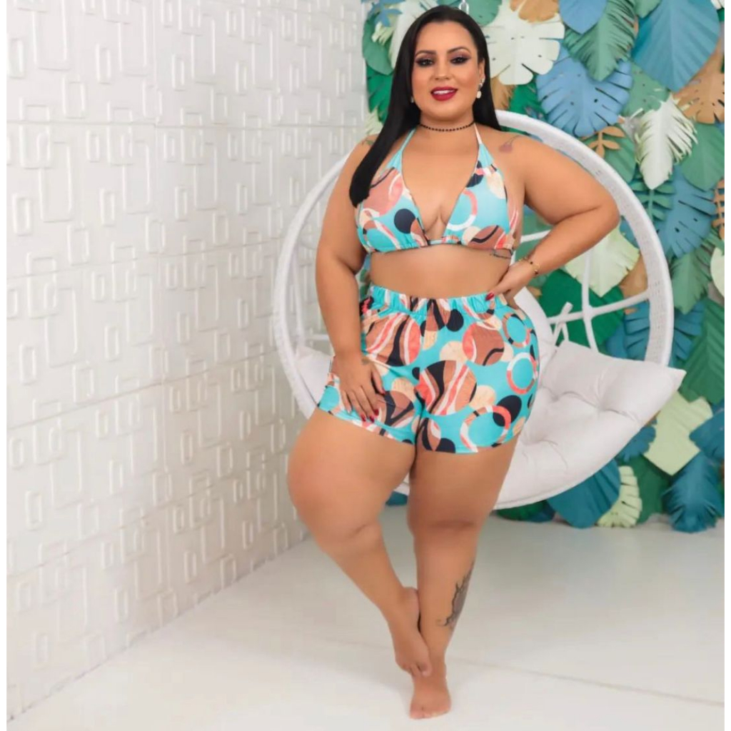 Conjunto Trikini 3 Peças Biquini Feminino Plus Size Estampado Biquini + shorts com Bojo
