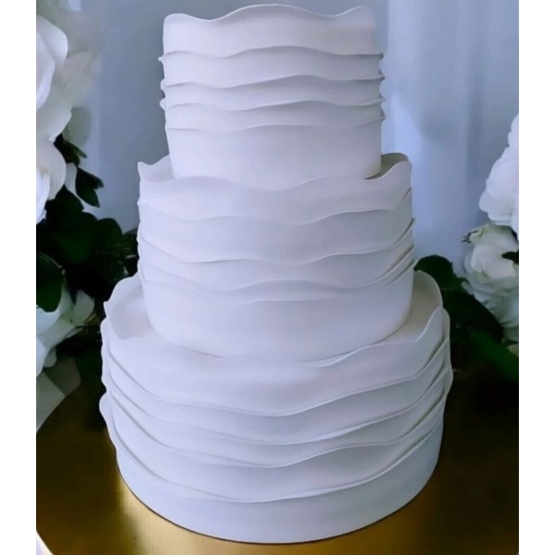 Bolo Fake Casamento Ruflado Flores Brancas 20x15x10 Efeito Espatulado Em EVA Sem Emendas