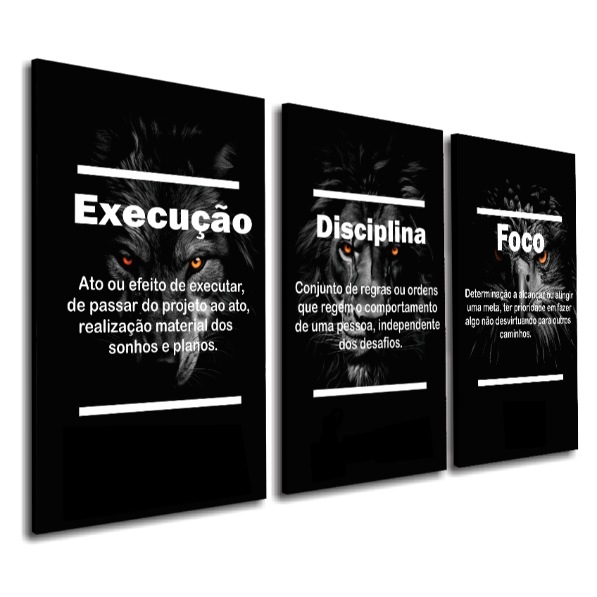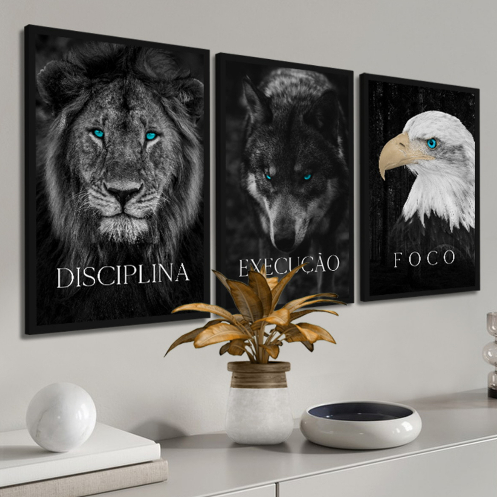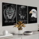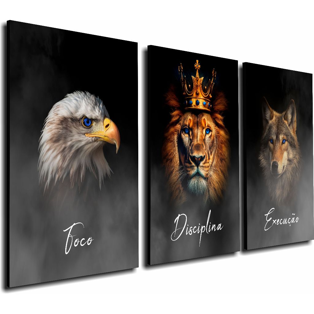 Quadro Decorativo Frases Leão Águia Lobo Disciplina Execução Foco 3 peças