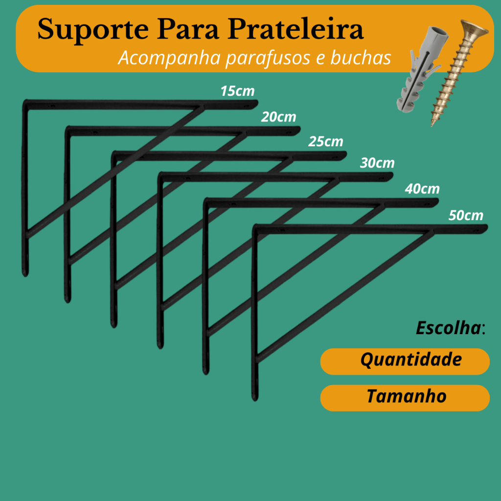 Mão Francesa Suporte para Prateleira Cantoneira Preta de 15cm a 50cm com Parafusos e Buchas