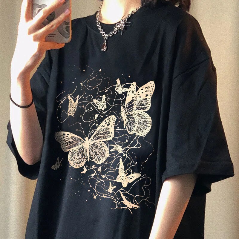 Borboleta Estampa De Ombro Camiseta Harajuku y2k Blusa De Rua Feminina Menina casual Japonesa Da Moda