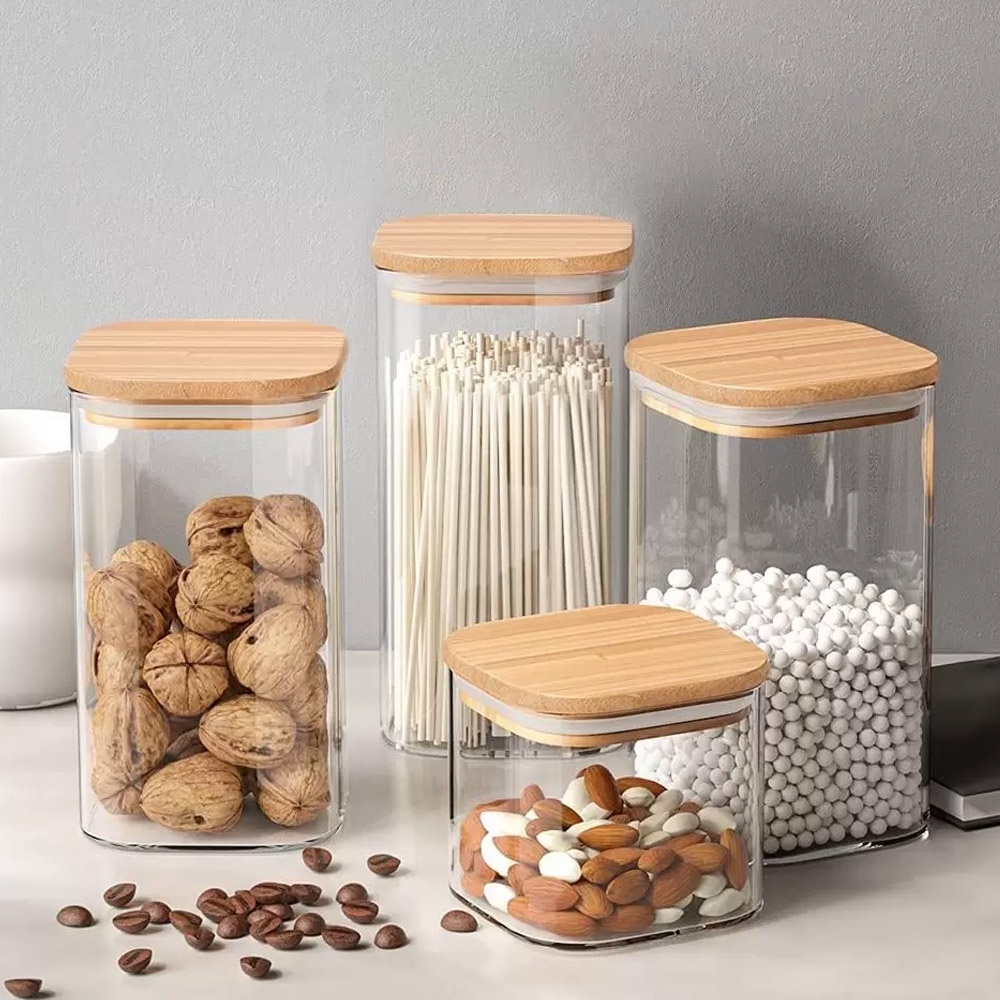 Kit 4 Potes Vidro Mantimento Hermético Tampa Bambu Quadrado