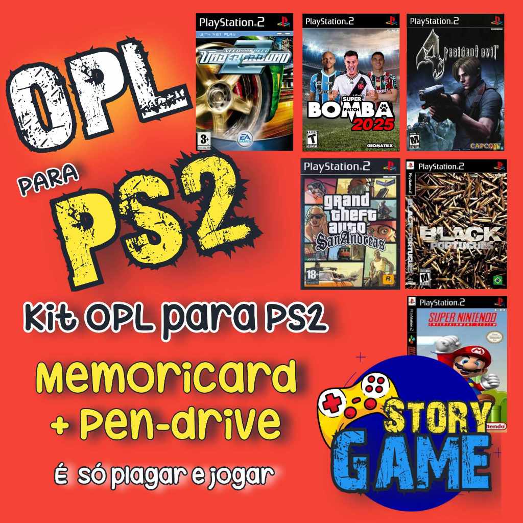 Kit Diversão Ps2 Play2 Pendrive 64Gb e Memory Card com 20 jogos + OPL