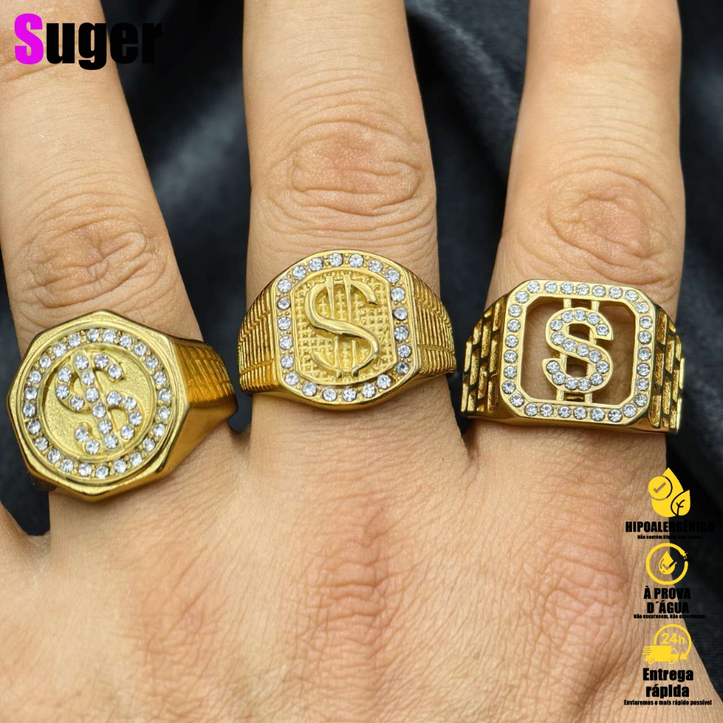 Anel Dedeira Cifrão Dinheiro Cravejado Com Embutimento De Cifrão Dedeira Masculino Em Aço Inoxidável Banhado A Ouro 18k
