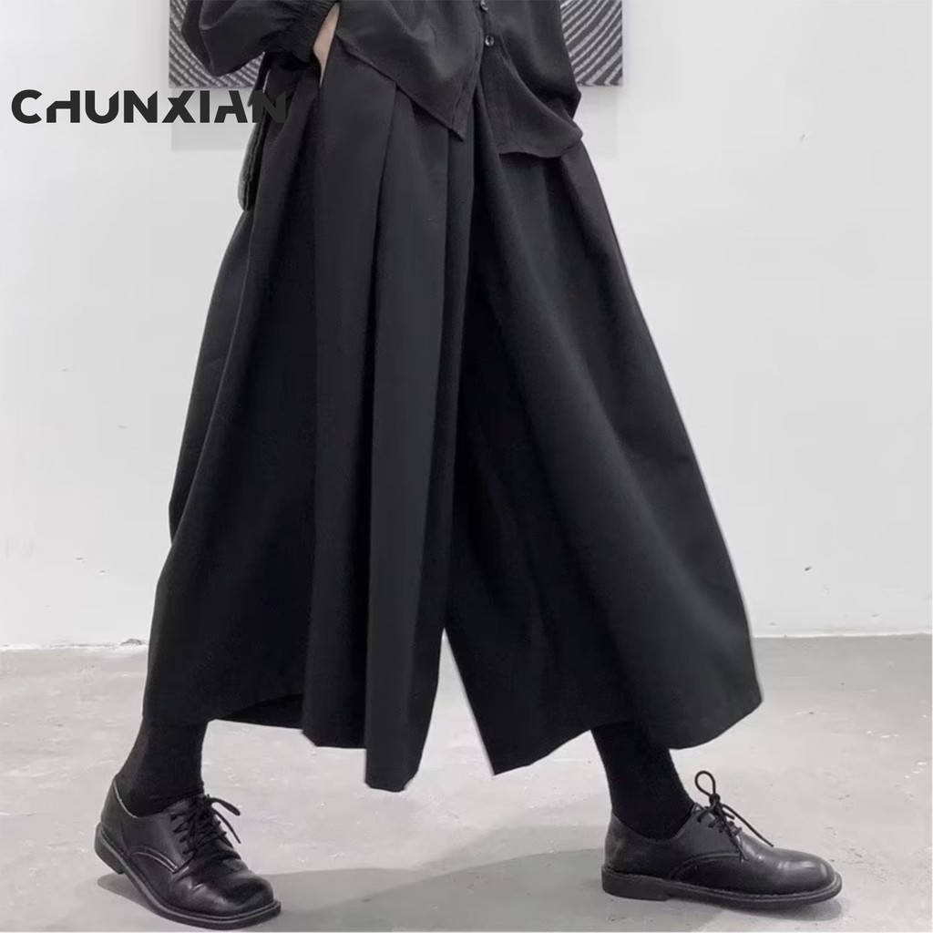 Novo Masculino Gótico Estilo Escuro Solto Cortado Hakama Perna Larga Design Sentido Samurai Calças