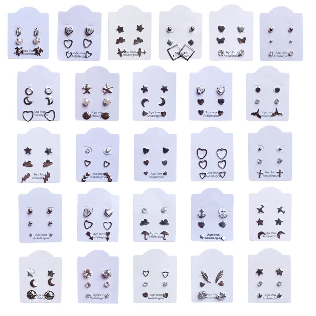 Kit Brinco 3 Pares Aço Inox Cirúrgico Atacado Trio Brincos Strass Bolinha Pedra Cartela de Brincos