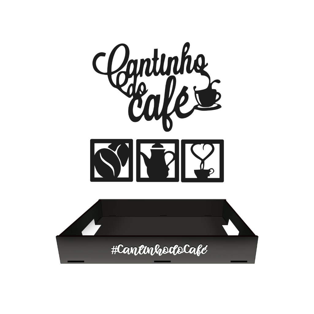 Kit Bandeja Cantinho do Café + Apliques Decorativos 4 Peças em Mdf Com Alças para Servir Cafe Cha
