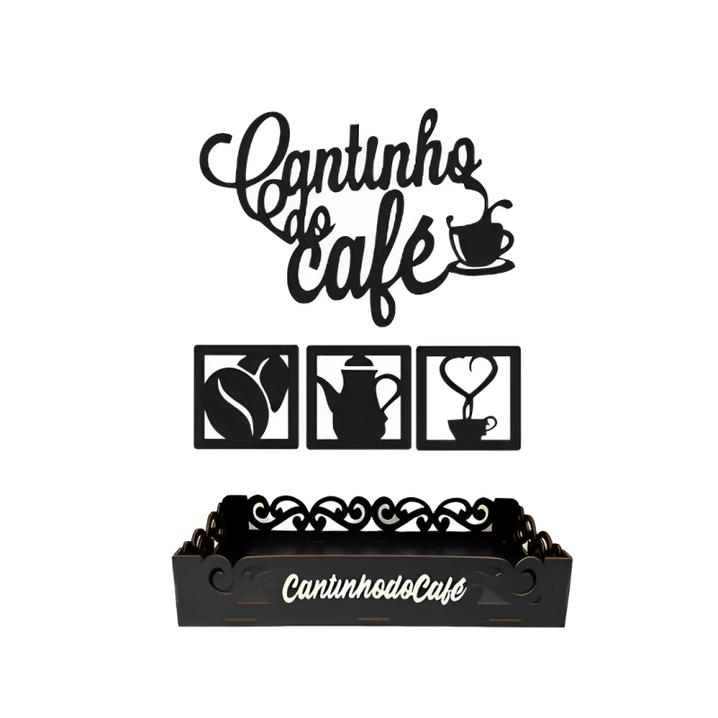 Kit Cantinho do Café com Bandeja Café da Manhã e Quadro Decorativo MDF Premium Preto