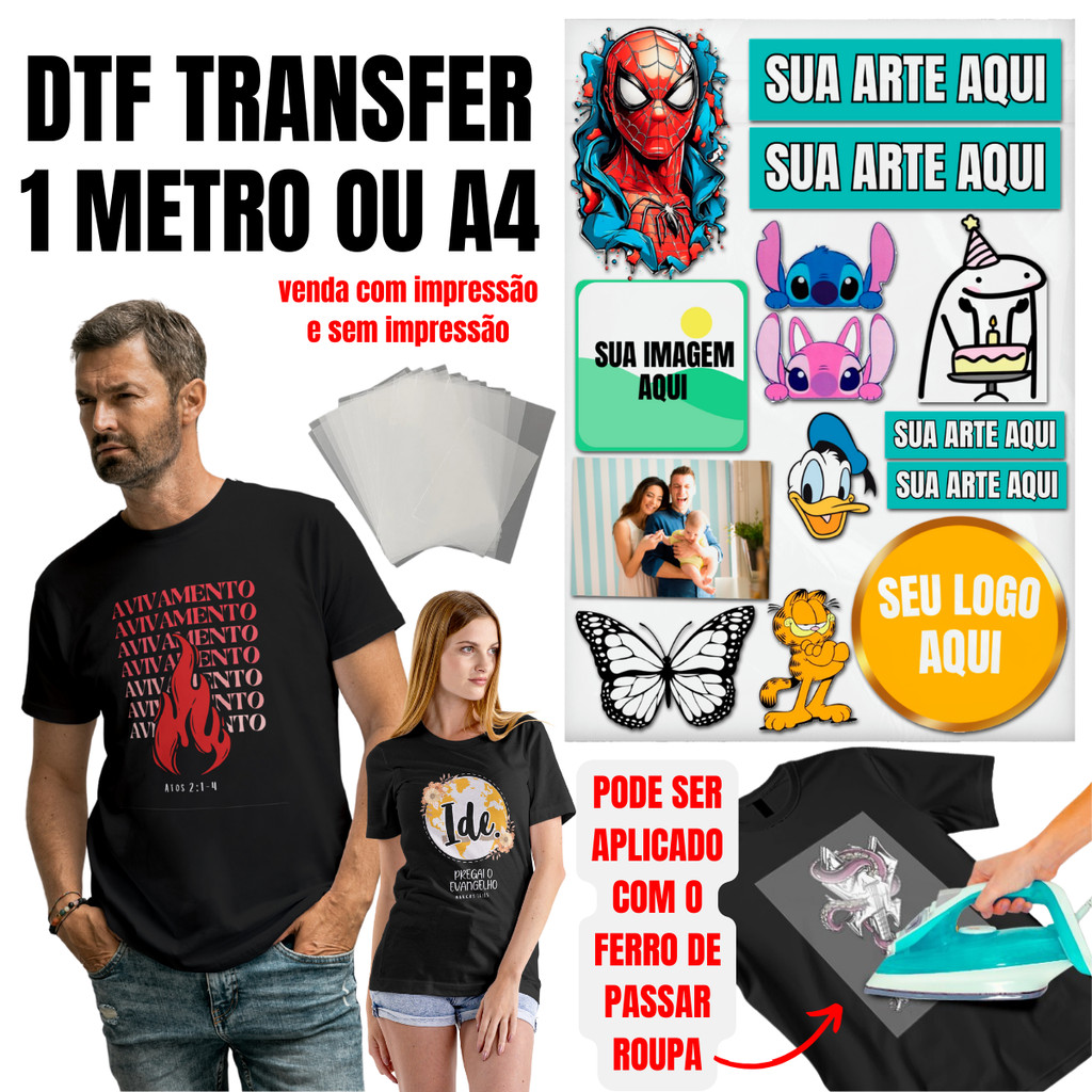DTF Folha A4, Meio Metro e 1 Metro Impressa Com Sua Arte Pronto Para Aplicação Envio rápido