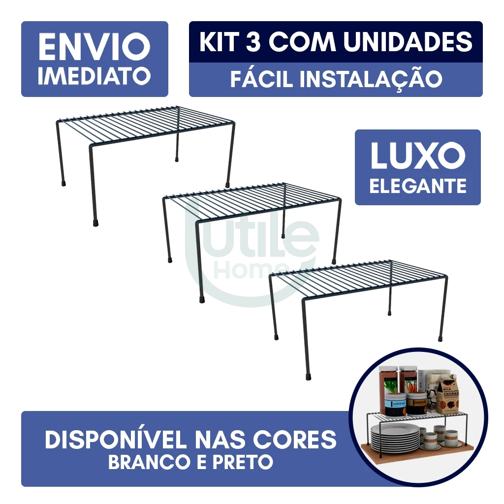 Kit 3 Organizador Suporte de Armário Cozinha Prateleira Pratos Copos Aramado