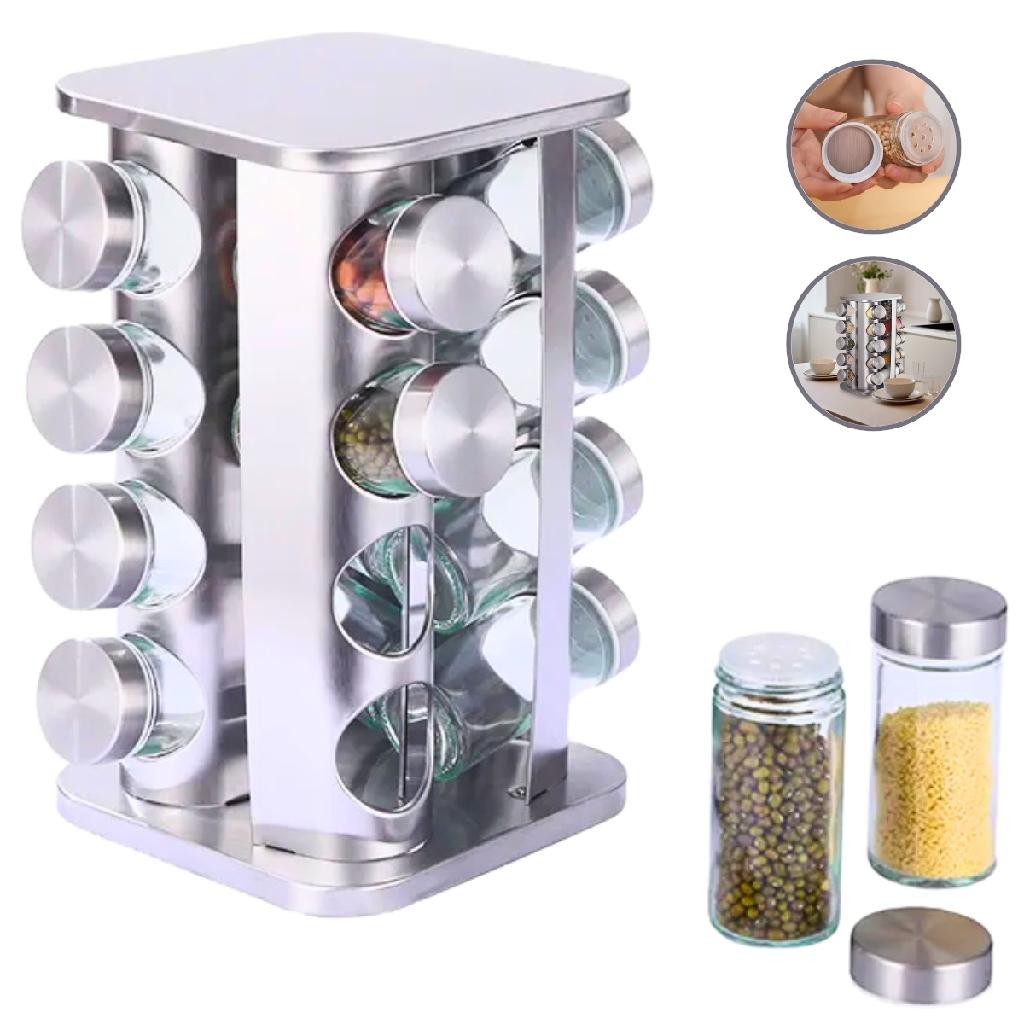 PORTA CONDIMENTOS Temperos Giratório QUADRADO em Inox 16 POTES DE VIDRO + Suporte Giratório Tempero