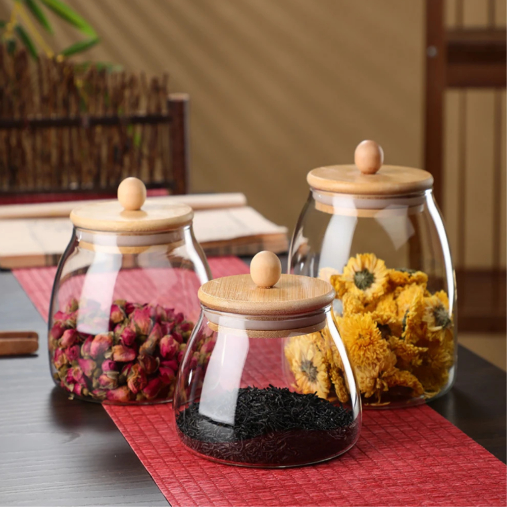 Kit Potes vidro herméticos BOLINHA TRANSPARENTE com tampa de bambu para mantimentos PMG
