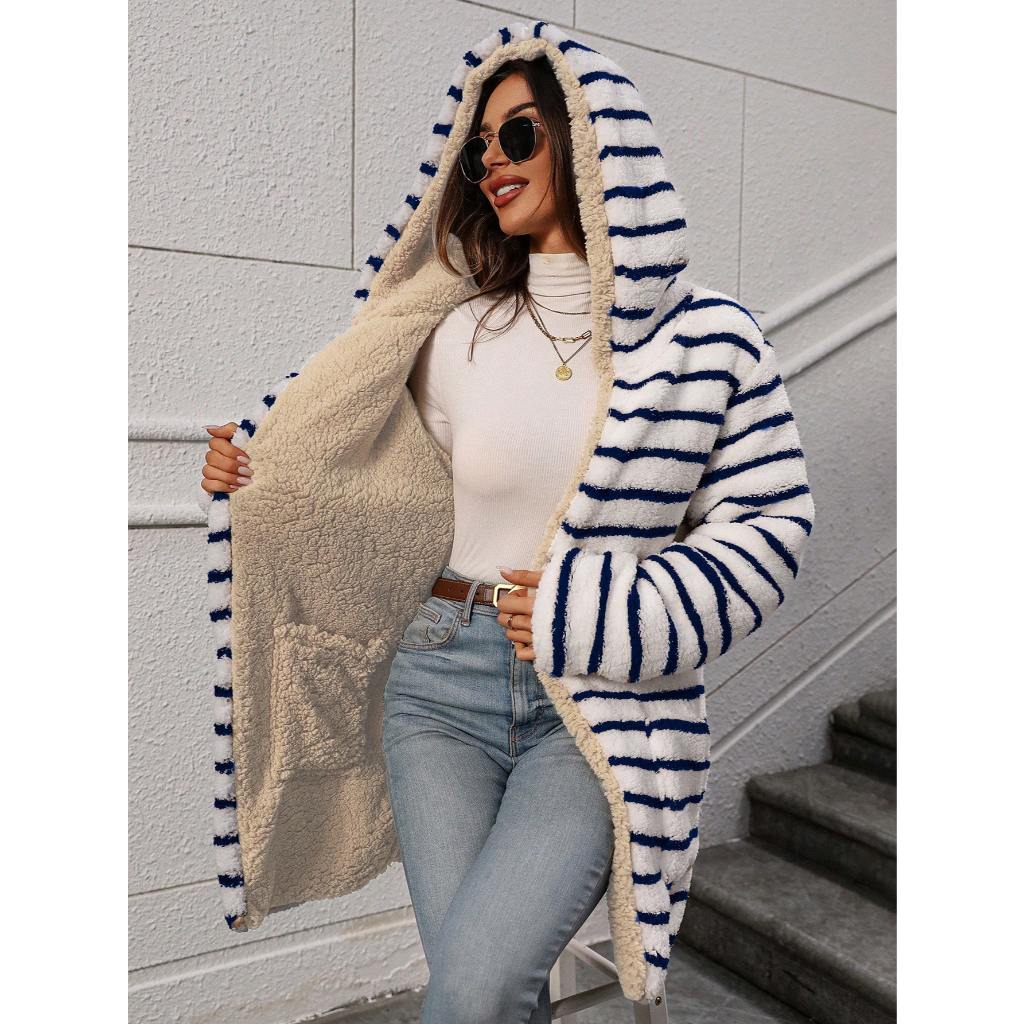 Casaco longo pelucia listrado com capuz dupla face reversivél moda outona e inverno
