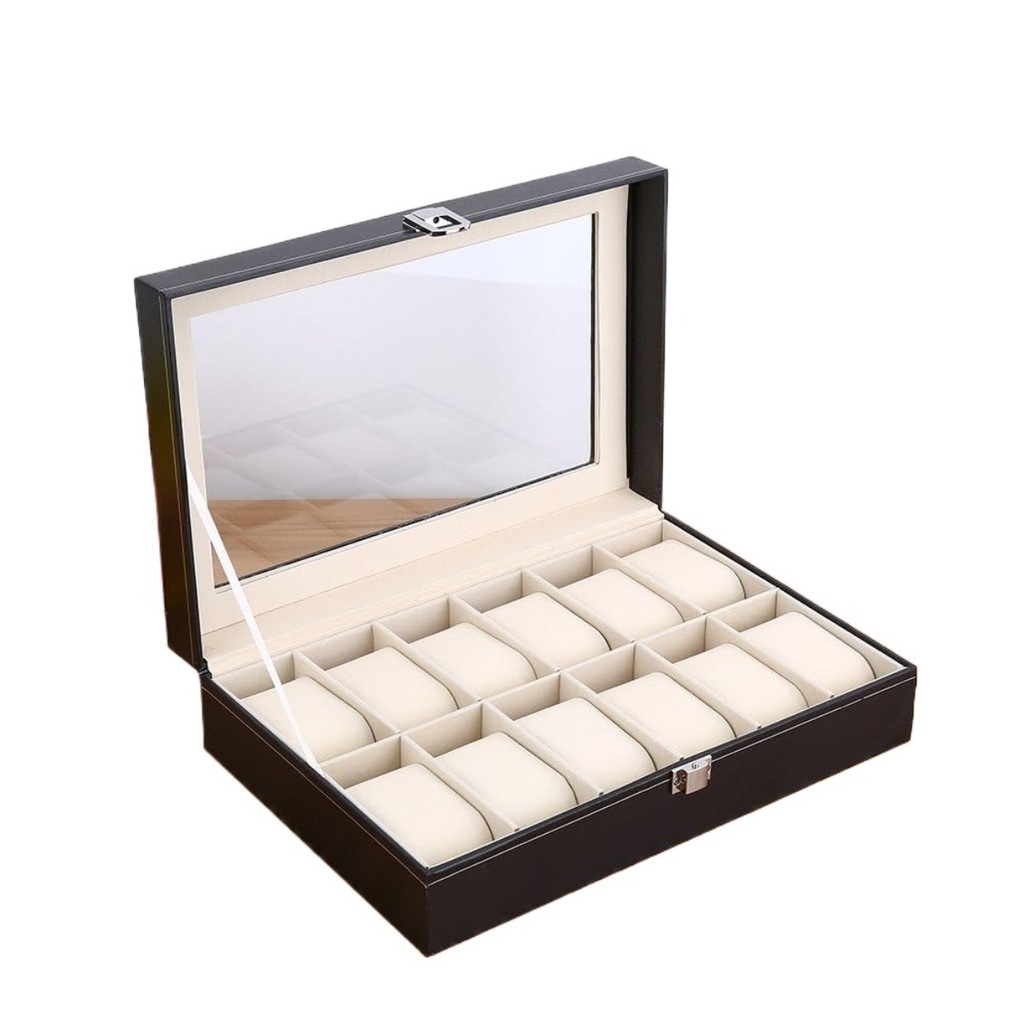 Organizador de Relógios e Joias com 12 Compartimentos e Tampa de Vidro – Sofisticado e Funcional
