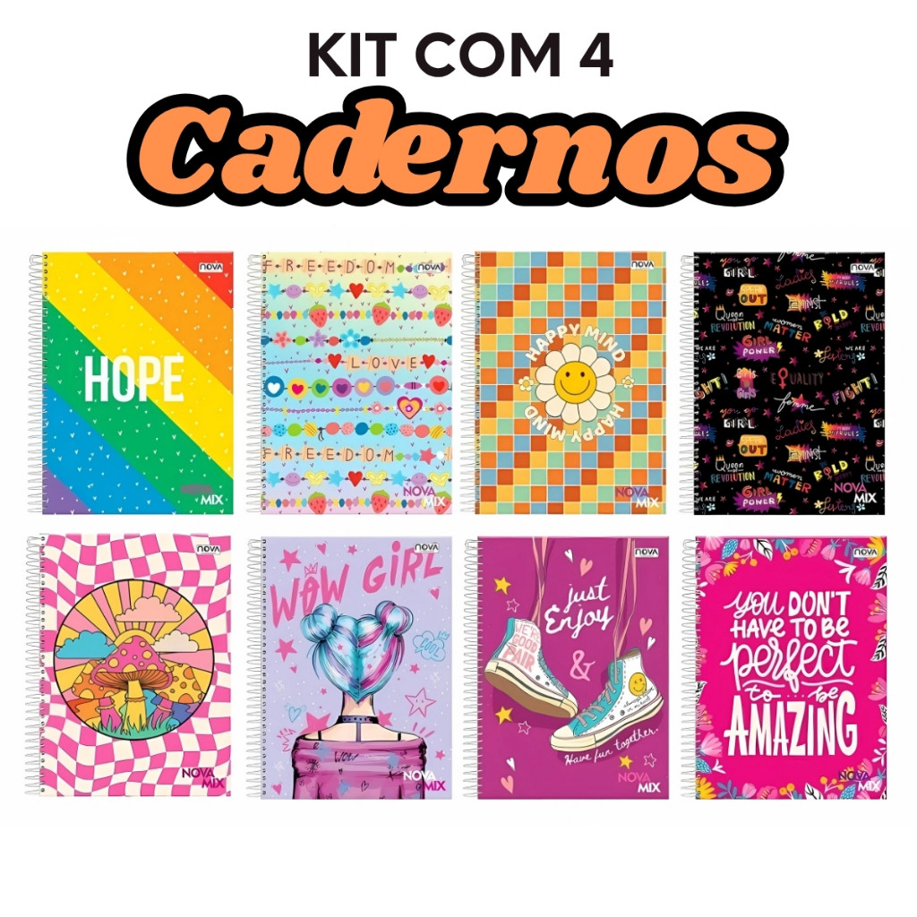 Kit 4 Cadernos Escolar 1 Matéria Feminino Capa Dura Universitário Arame