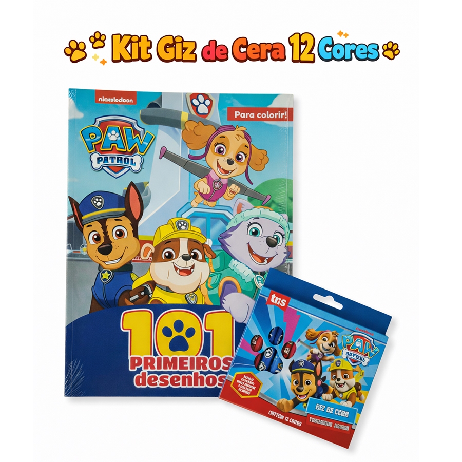 Kit Livro 101 Primeiros Desenhos Patrulha Canina + Giz de Cera 12 Cores Oficial