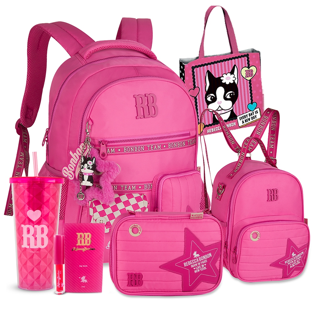 Kit Mochila Costas Estojo Lancheira RB College Guarda Chuva Caderno Bolsa Rebecca Bonbon Original Colegial Adolescente Pompom Meninas Lancamento