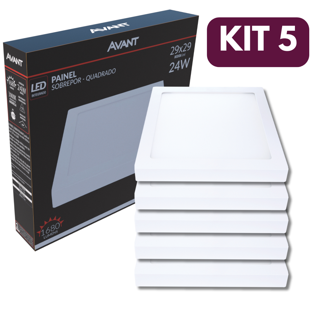 Kit 5 Luminária Painel Plafon Led 24W Avant Quadrado Sobrepor Branco Frio 6500K Bivolt