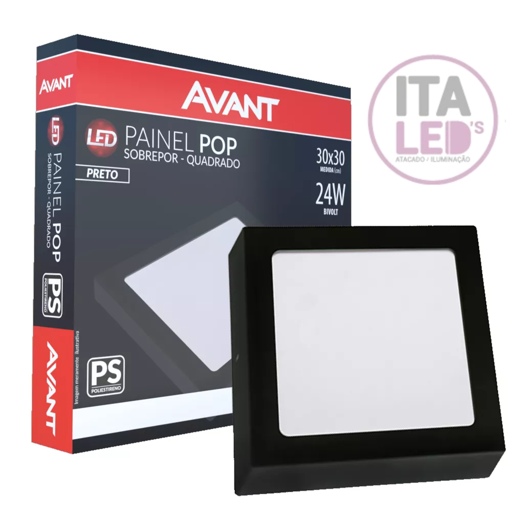 Luminária Painel Plafon Led 24W Preto Quadrado Sobrepor Avant Branco Frio 6500K Bivolt