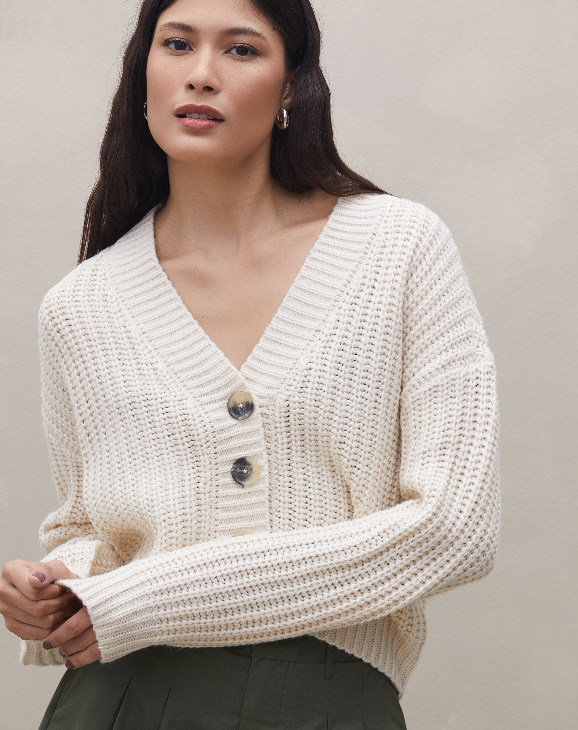Cardigan com Botão Tartaruga de Tricot - Cru