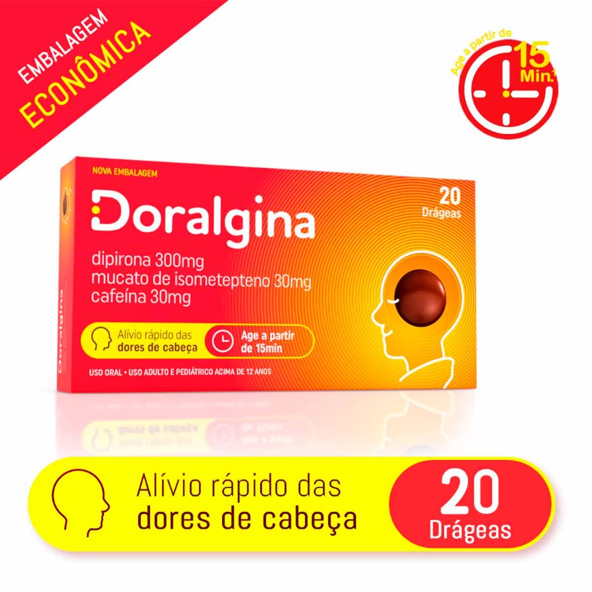 Doralgina Dipirona Sódica 300mg + Isometepteno 30mg + Cafeína 30mg 20 drágeas
