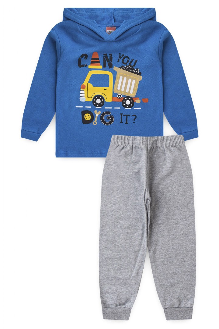 Conjunto Bebê Masculino Moletom Blusa com Capuz Azul Caminhão e Calça Mescla (1/2/3) - Cleomara