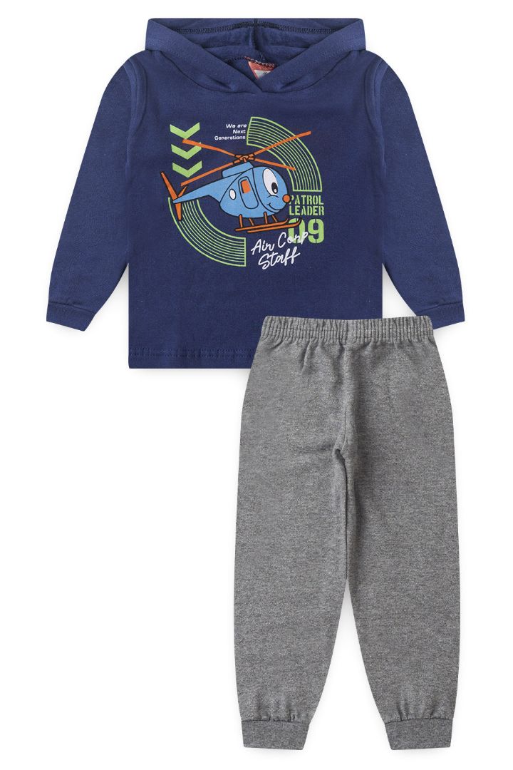 Conjunto Bebê Masculino Moletom Blusa com Capuz Marinho Helicóptero e Calça Cinza (1/2/3) - Cleomara