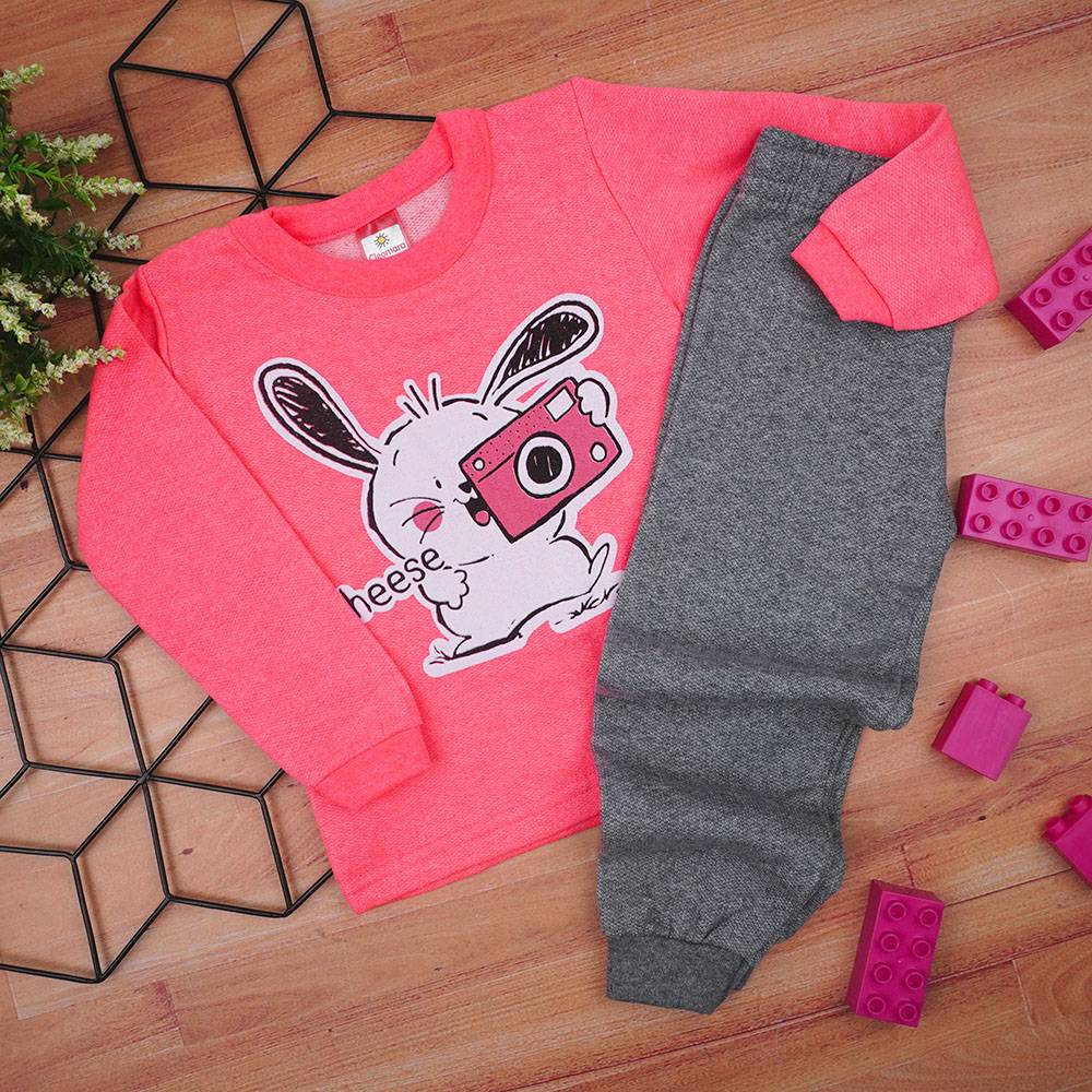 Conjunto Bebê Feminino Moletom Blusa Rosa Neon Coelhinha e Calça Mescla (1/2/3) - Cleomara