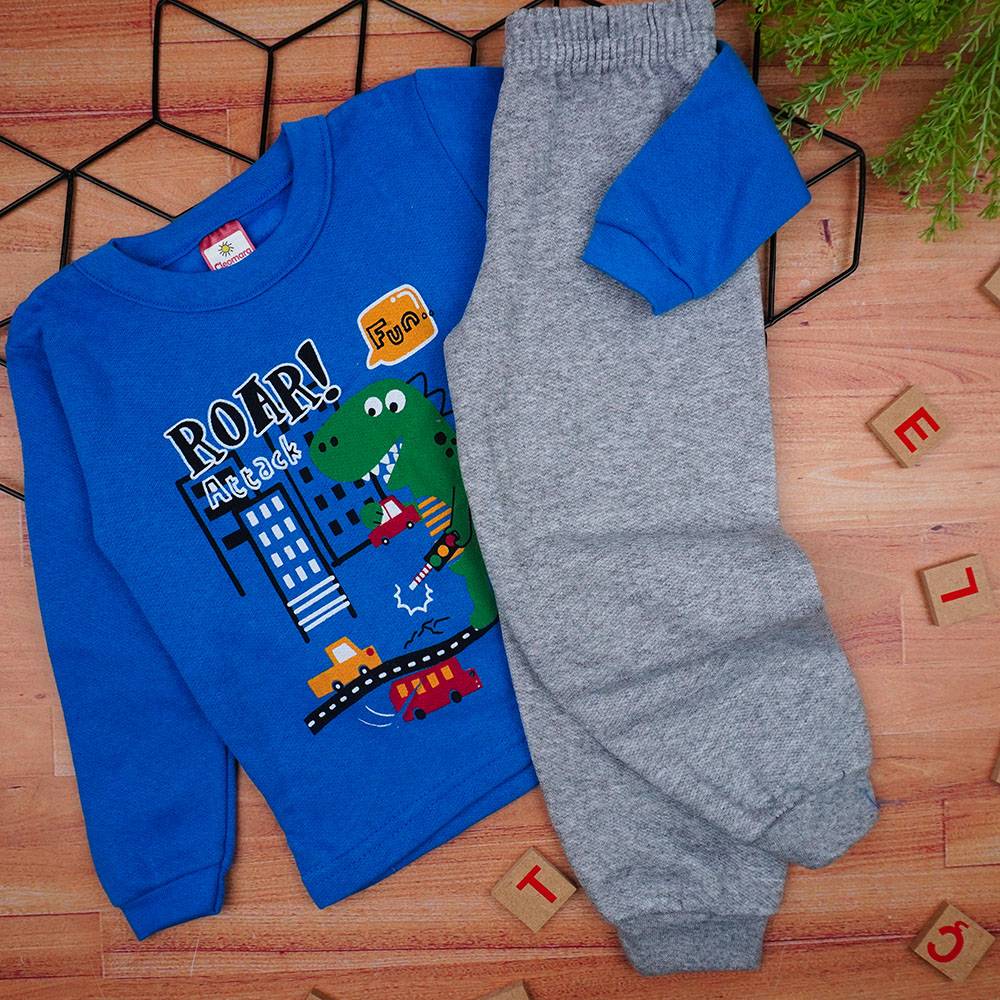 Conjunto Bebê Masculino Moletom Blusa Azul Royal Dino e Calça Mescla (1/2/3) - Cleomara