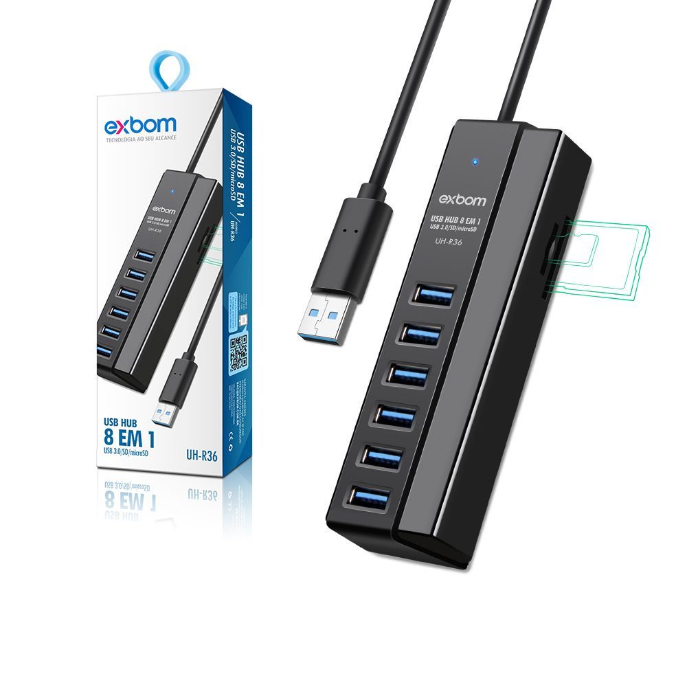 HUB USB 3.0 Combo 8 em 1 UH-R36 com 6 portas e 2 portas Leitor de Cartão SD/MicroSD e carregamento smart inteligência
