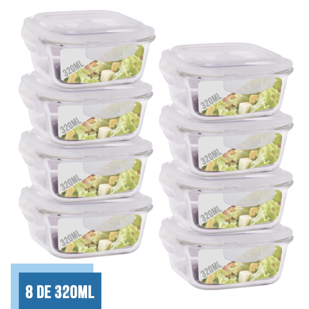 Jogo com 8 Pote Vidro Hermético Marmita Tampa Plástico 320ml