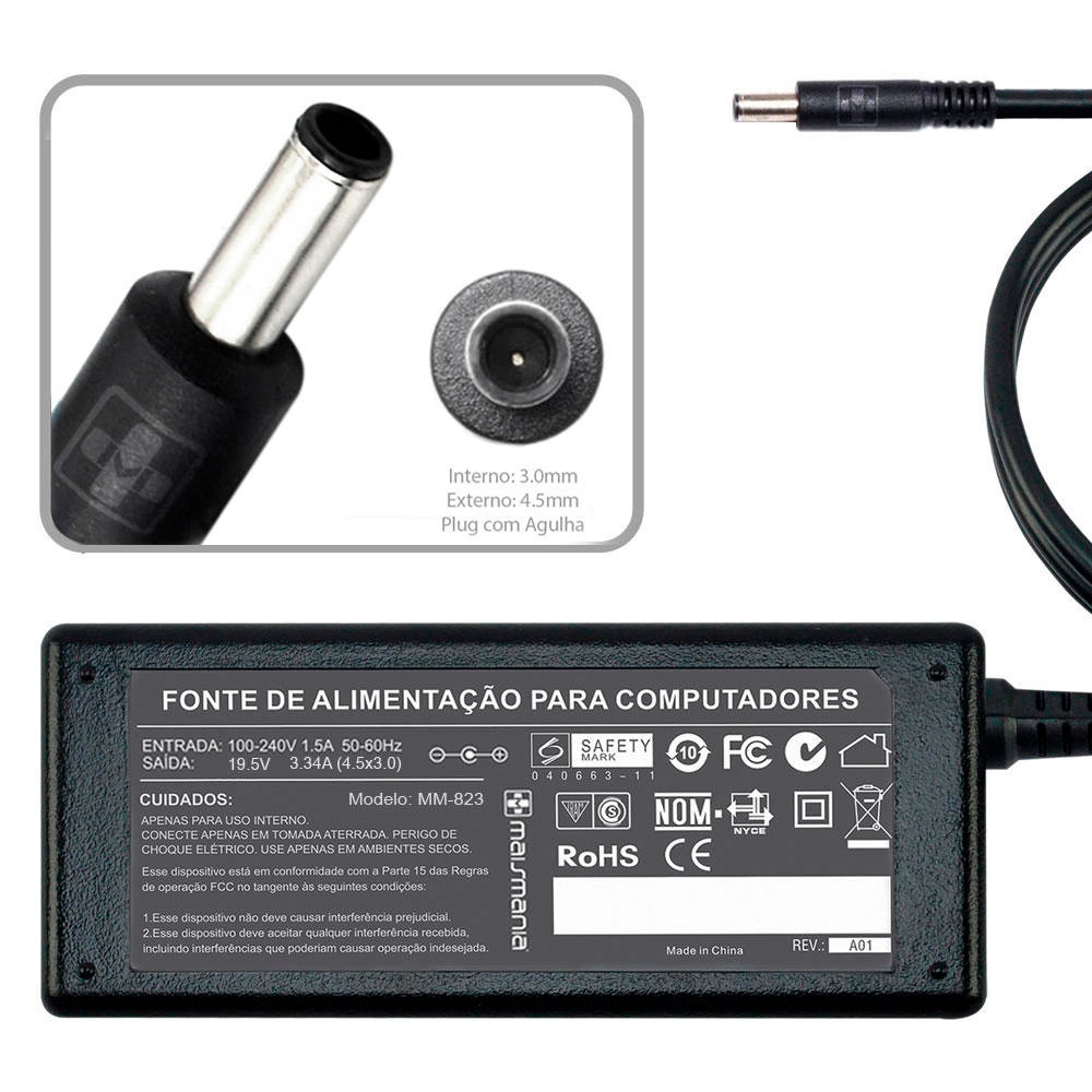 Fonte Carregador Compatível Para Dell 19.5v 3.34a Plug 4.5mmx3.0mm 823