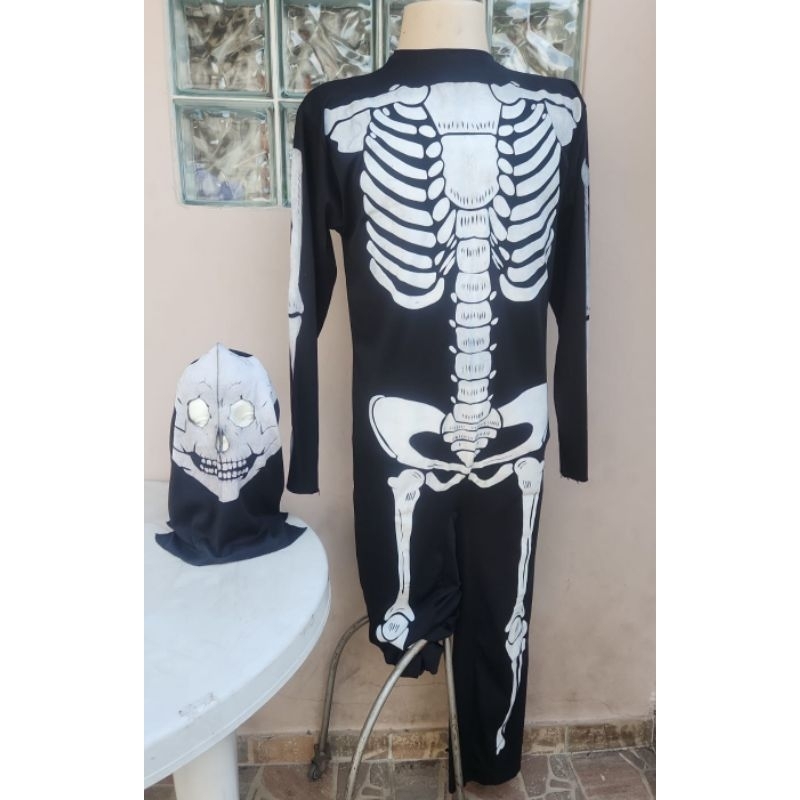 Fantasia Esqueleto / Caveira Macacão preto malha estica, fecha com zíper + máscara Adulto _USADA com_DESFIADOS