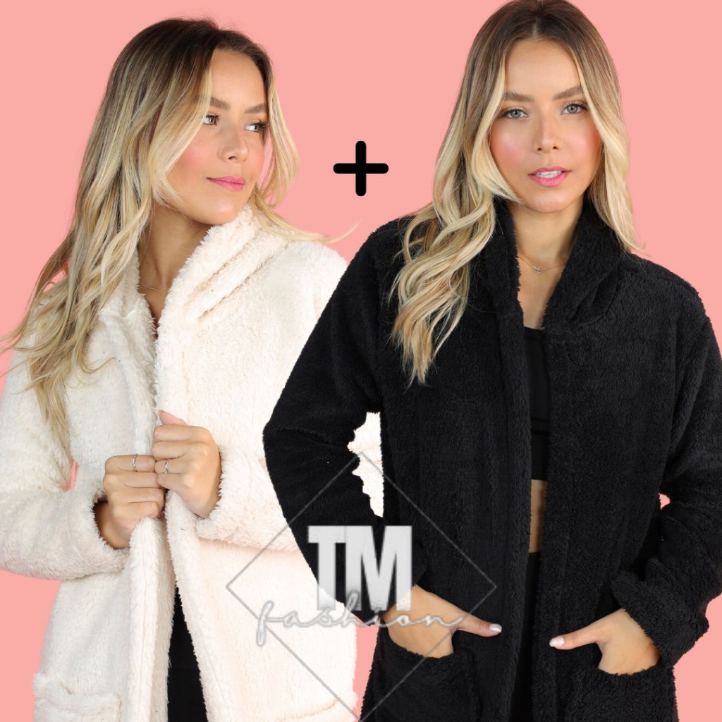2 Casaco Teddy Feminino Preto Longo Ted Inverno Frio Pelo de Carneiro Pelúcia Lançamento Moda Feminina Promoção