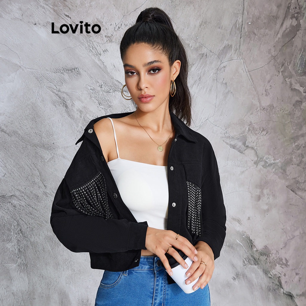Lovito Jaqueta de Bolsos com Franja e Tecido Liso para Mulheres LBE02077 (Preto)