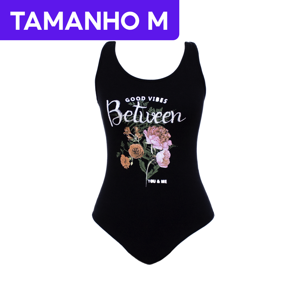 Body regata preto liso com estampa tamanho M nadador decote redondo sem manga com abertura embaixo cotton Marisa algodão elastano Good vibes between you & me