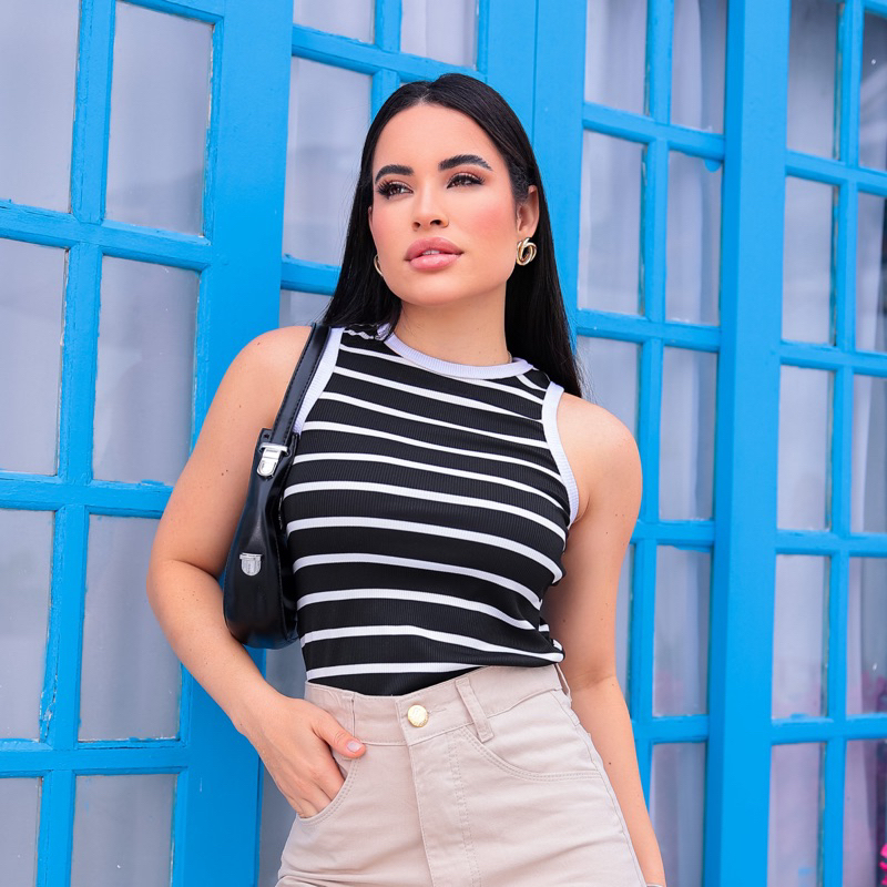 Regata feminina canelada algodão listrada blusinha básica preto e branco ribana