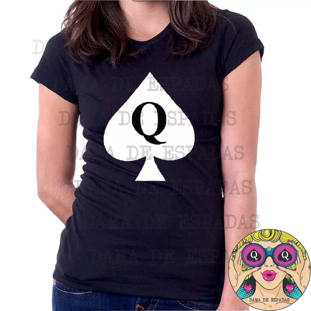 Camiseta Algodão preta MODELO BABY LOOK com estampa DAMA DE ESPADAS 01