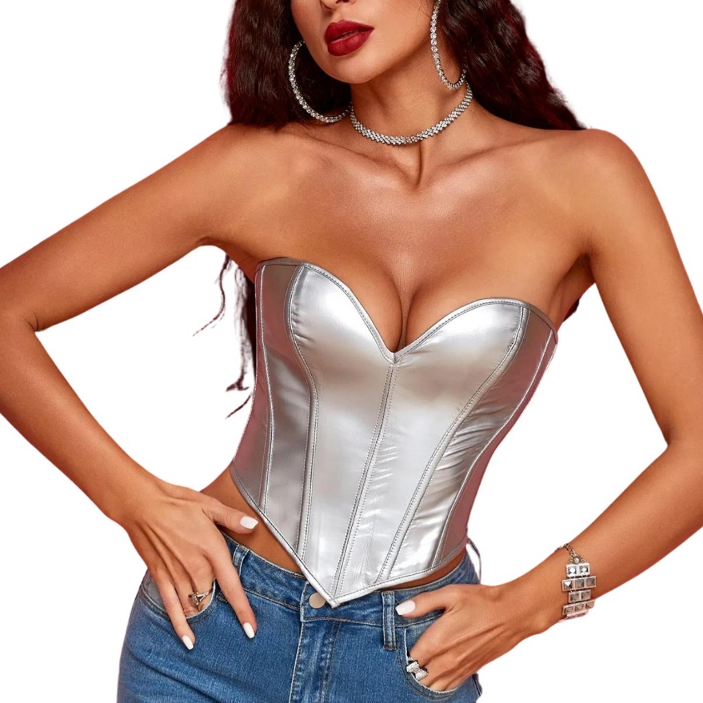 Cropped Top Blusa Bustier Tipo Corset Modelador com Barbatanas Couro Sintético Prata M862