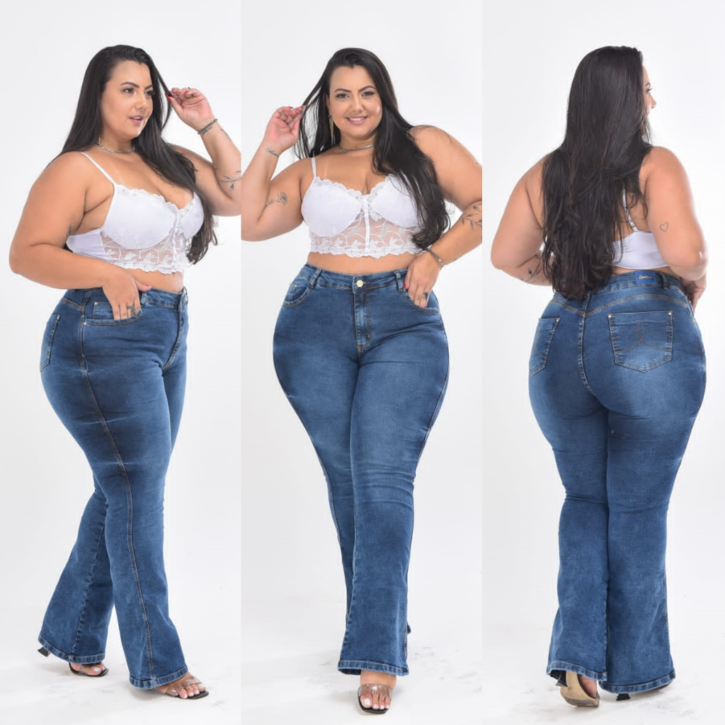 CALÇA JEANS PLUS SIZE FLARE PREMIUM LEVANTA BUMBUM COM LYCRA 46 AO 56